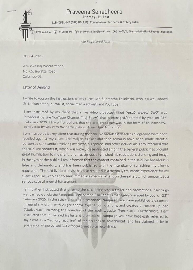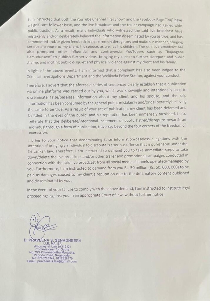 ප්‍රසිද්ධ යූ ටියුබ්කරුවෙකු වන සුදත්ත තිලකසිරිගේ කීර්ති නාමයට හානි වූ බව දන්වමින් සුදත්ත තිලකසිරි විසින් නීතීඥවරියක මාර්ගයෙන් ඉරාජ් වීරරත්න වෙත එන්තරවාසියක් යොමුකර තිබෙනවා. ඒ “Iraj Show” යූ ටියුබ් නාලිකාවේ පළකරන ලද වීඩියෝවක් සම්බන්ධවයි
